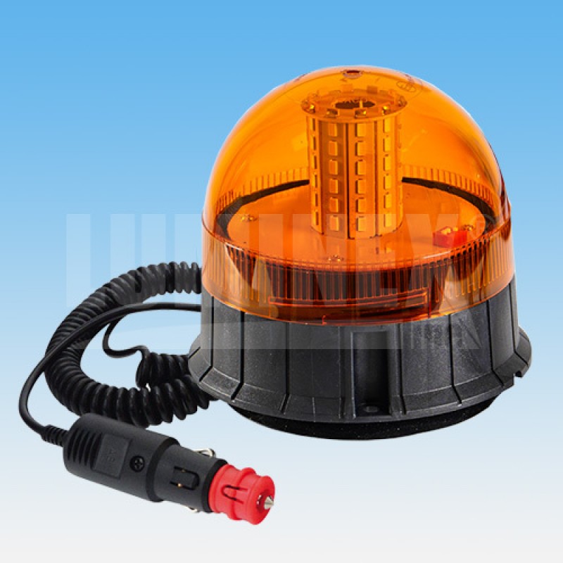 LED BEACON - MAGNETIC BASE. 60x LED, 15 W. 120x Flashes per Minute. Double flash. DIMENSION: HEIGHT - 135 mm, D: 142 mm. Cable 2,5 m. Homologation R10. Meets IP 56 protection standards. -30°C to +50°C.